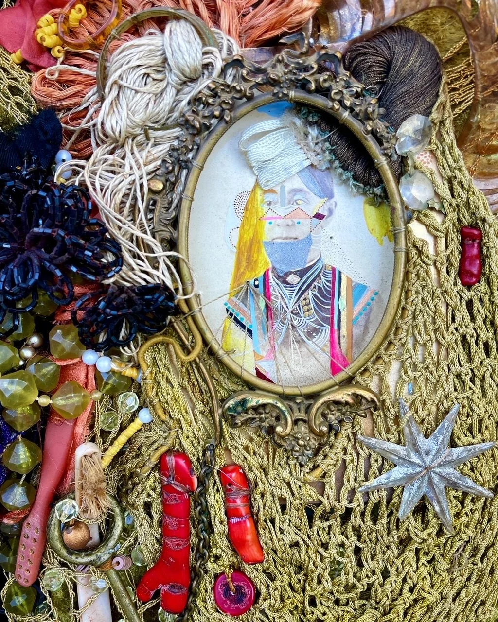 The act of taking the found portrait of a forgotten figure and surrounding the individual with objects that stretch into futures that person couldn’t have fathomed, works to shift their context and prolong the spirit from fading away. These reimagined narratives don’t prioritize the portrait sitter’s frame of reference as a solitary figure lost to time. Rather these fantastical transformations reconstruct them, creating new storylines full of possibilities. These new histories and embellishments recreate the narrative. They shift the white formal portrait gaze into an alternate past where instead the colonizers adopt indigenous ornamentation, styling, and modes of living. In kind, these designs and objects worn outwardly relayed the stories of that person's life, accomplishments, individuality and experiences, as many tribal regalia around the world does.