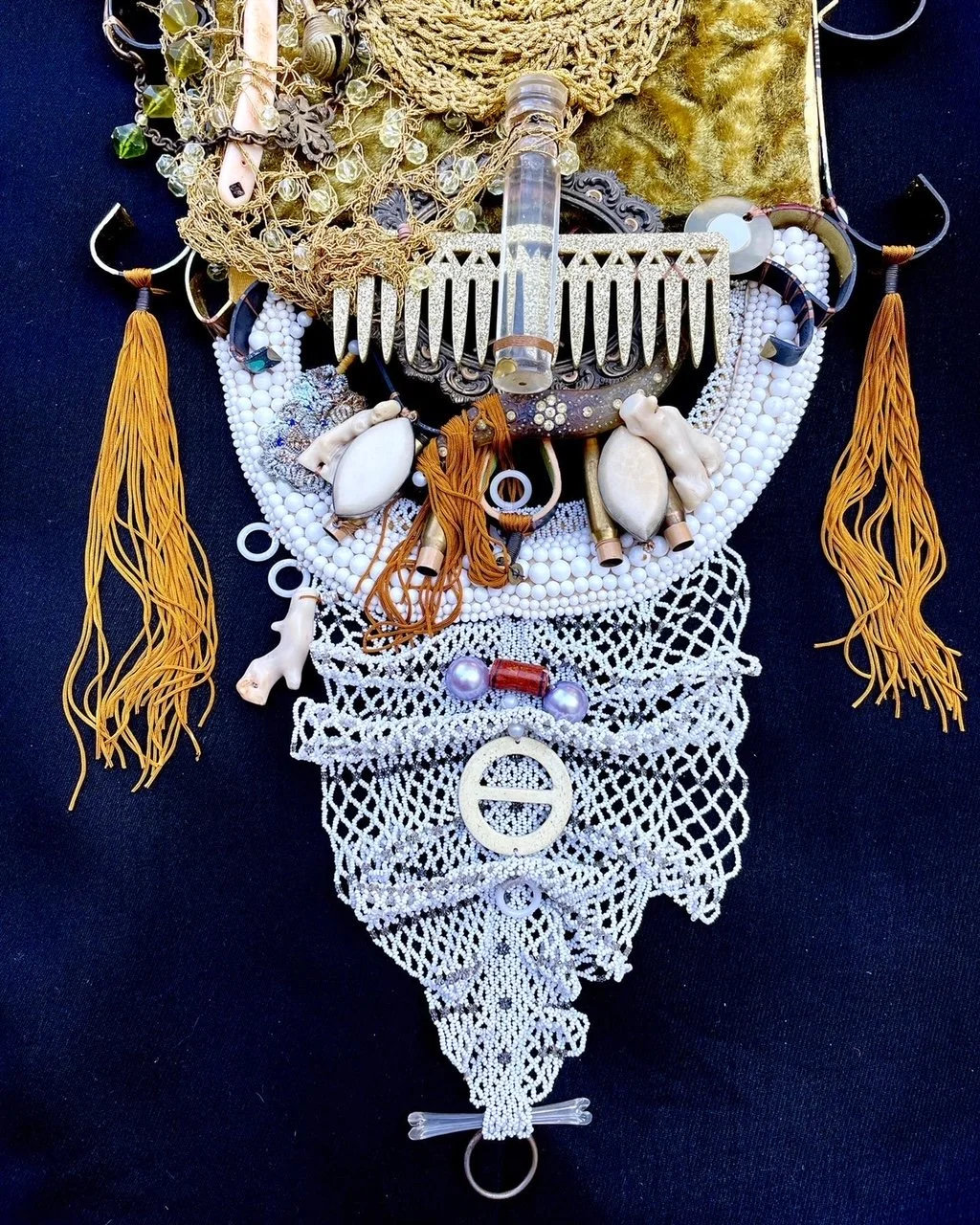 Historical references: Two pieces sewn into the fabric of this work include the black silk hand embroidered floral ribbon and the white beadwork netted collar piece; created by Bertha LaMers and gifted to the artist by her great granddaughter, Joan LaCasse.